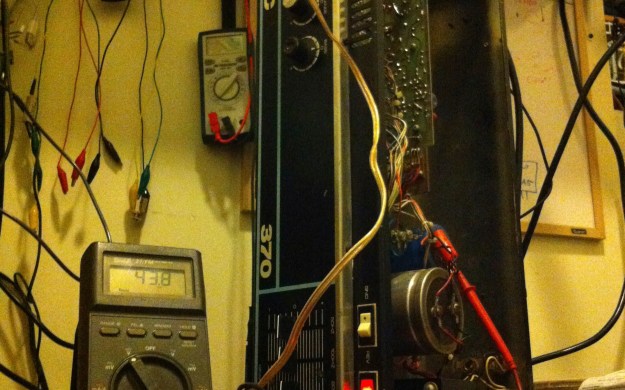 Heavy 370 on the bench getting a lot of little 1uF caps replaced. It is a single supply amp meaning the output sits at half the supply voltage. Instead of the output signal swinging between a +/- voltage rail it swings from about 0-90VDC. The signal is coupled from the output section to the speaker via a large cap that blocks the DC. The voltage at this capacitor must be about half the supply voltage for symmetrical clipping, with positive signal swings between ~45-90V and the negative section in the ~0-45V region.
