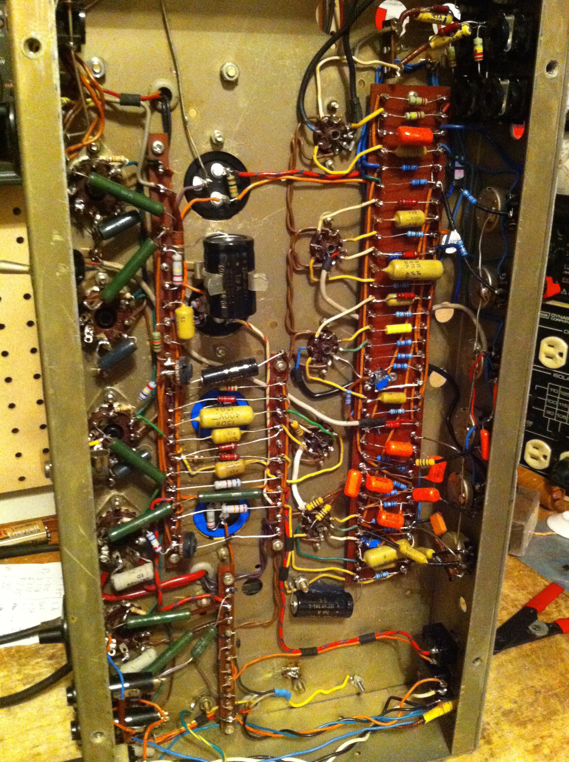 Poor lighting but you get the idea. Turret board is rugged. All 12AX7 tubes are in order from top to bottom, V1 to V5, with V5 (bottom-most) as phase inverter.
