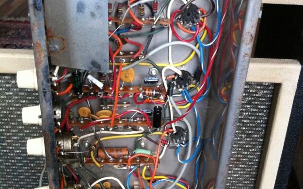 This Airline 62-9025A was manufactured by Valco in Chicago in the 60s. It is a department store amp, I think sold at Montgomery Wards. From my understanding it is the same circuit build as the Gretsch 6152 and the Supro 6422 amps which are single ended class A amps with tremolo and reverb. It has been living ruff n rugged.