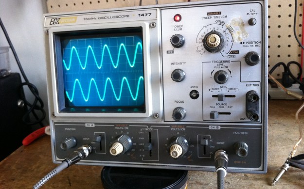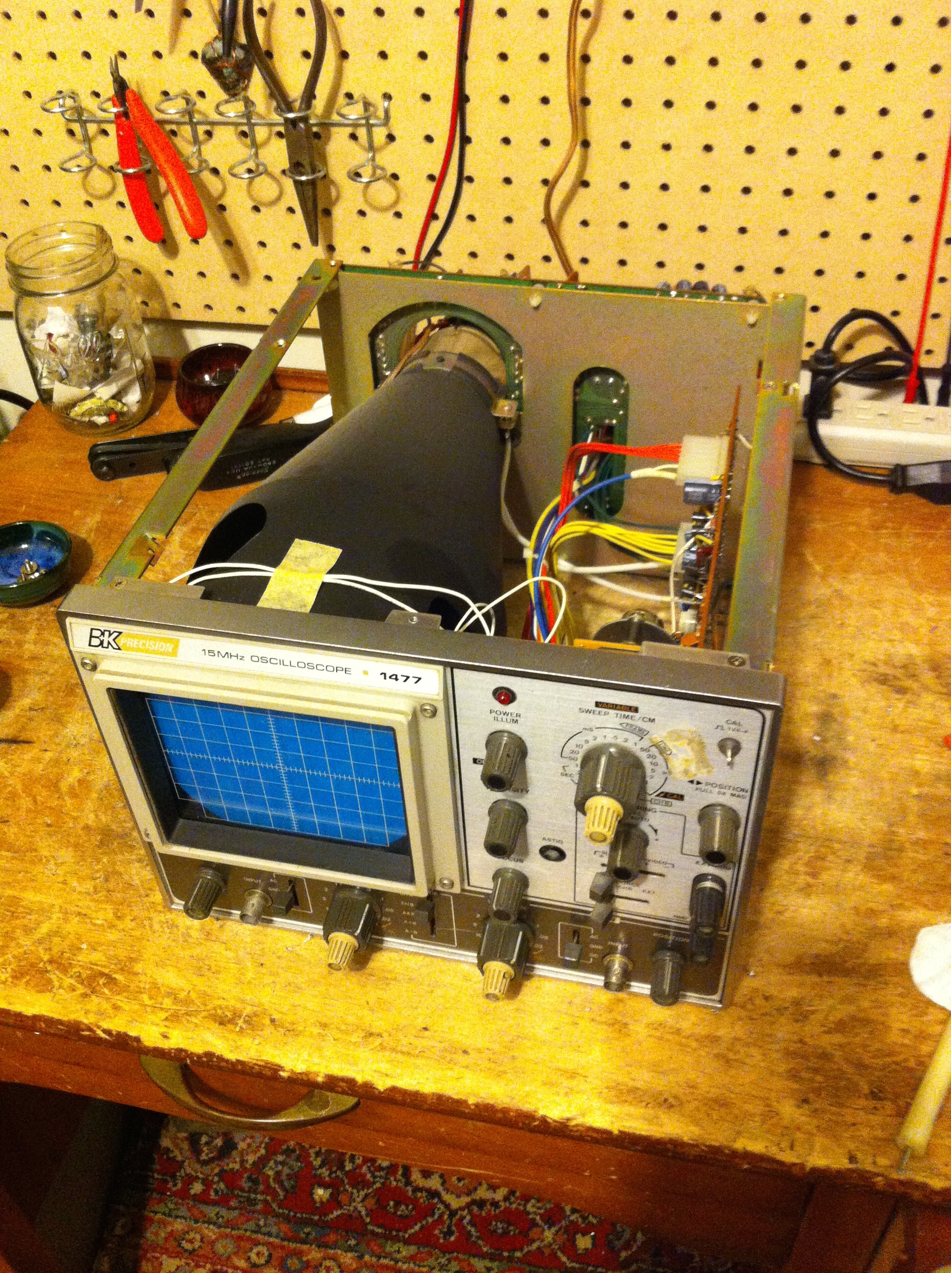 It is a BK Precision 1477 which is a 15Mhz dual-trace scope. It is an old analog scope probably from the mid 80s and has a CRT screen which is actually just one big tube. CRT means cathode ray tube.