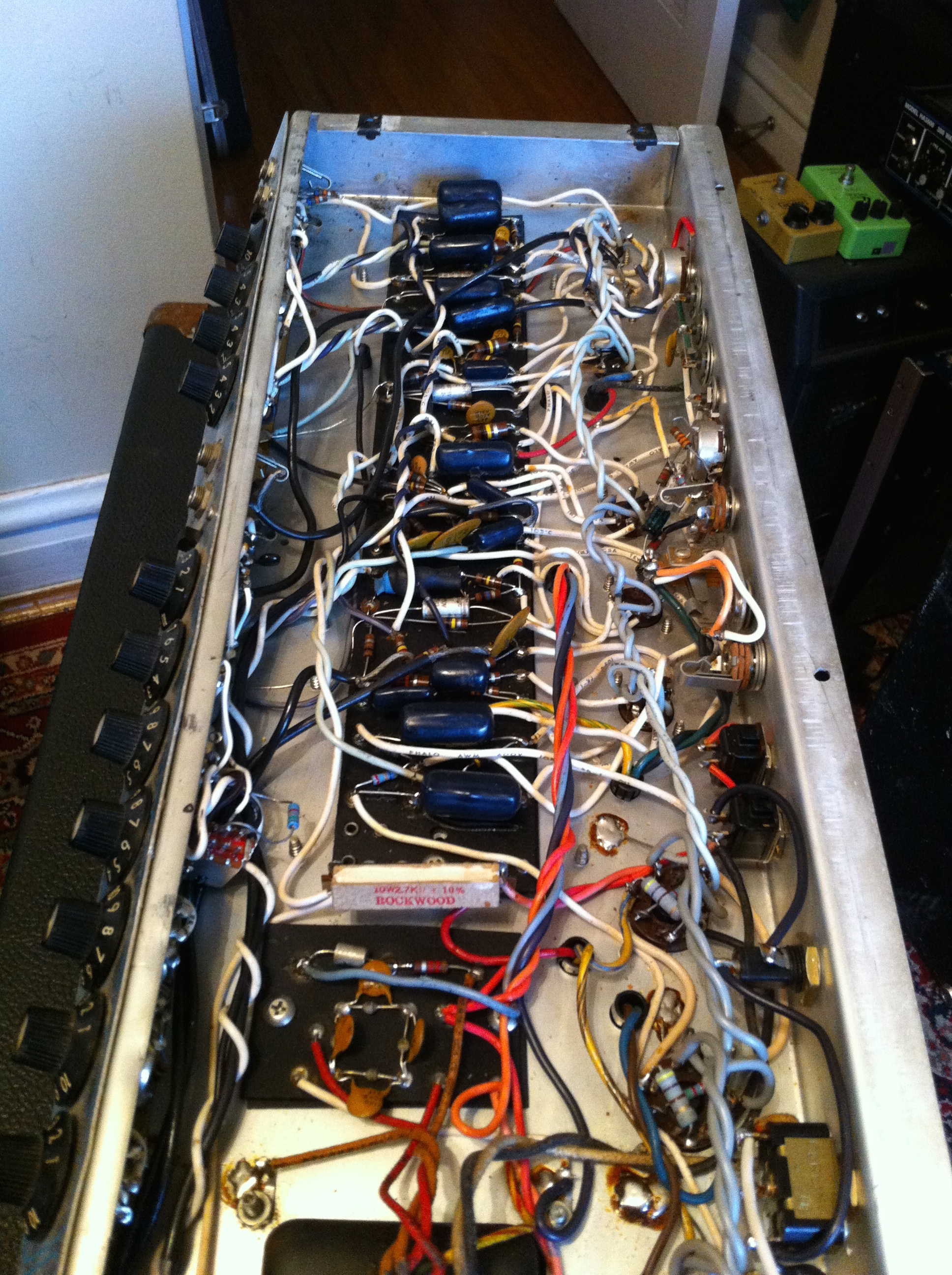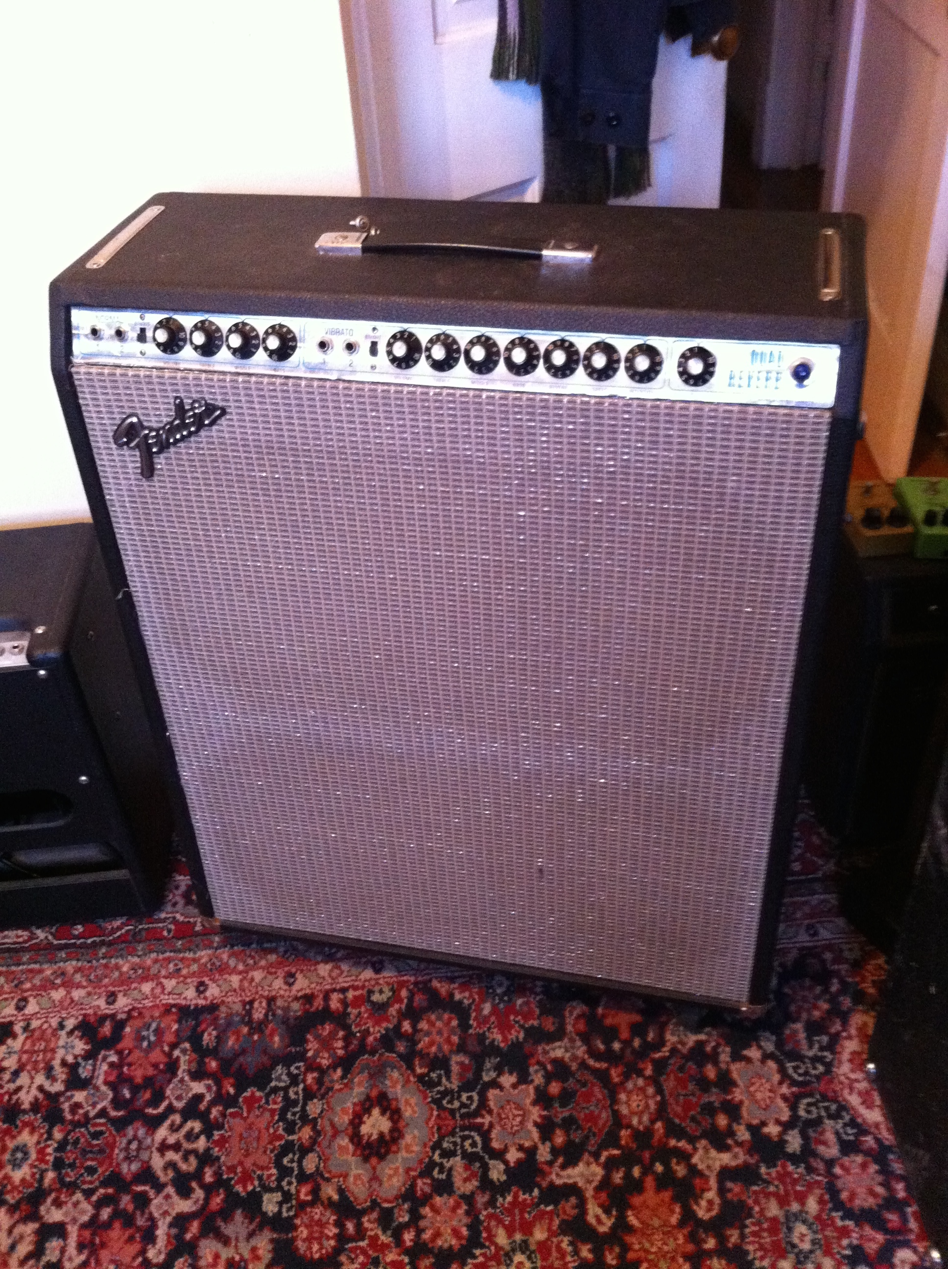 Fender Quad Reverb. Info straight from the horse’s mouth. Heavy 4×12 combo. Not as heavy as the Super Six though, which was the 6×12 Twin Reverb combo.