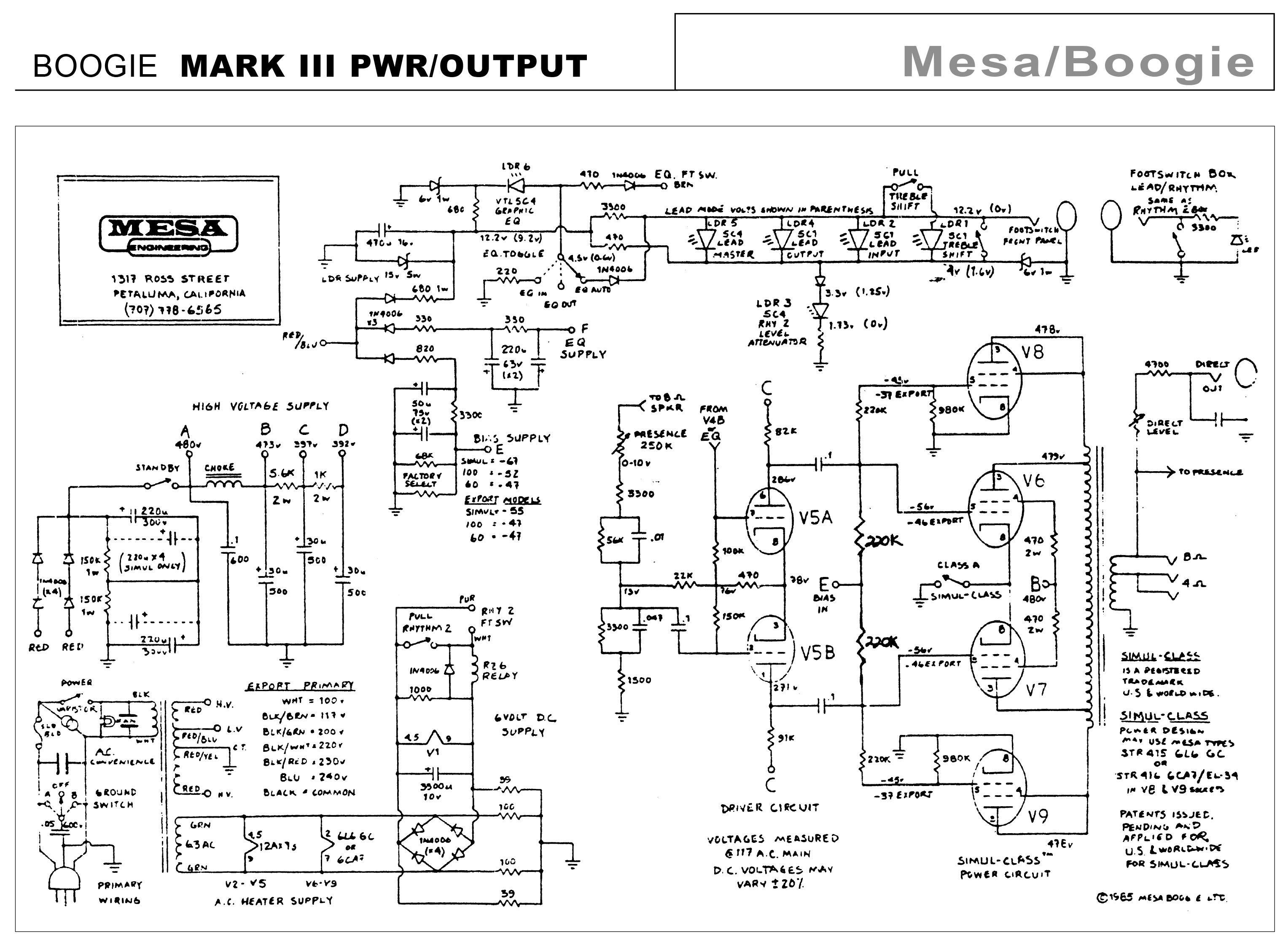 High tech amp. Has a simul-class power section which biases two EL34s in class A and four 6L6s tubes in class AB through the same output transformer. SO, at idle the EL34s when selected bias at about 70mA and drop to 30-40mA when cranked (class A), while the 6L6s idle around 30-40mA and rise to about 120-130mA when cranked (class AB).