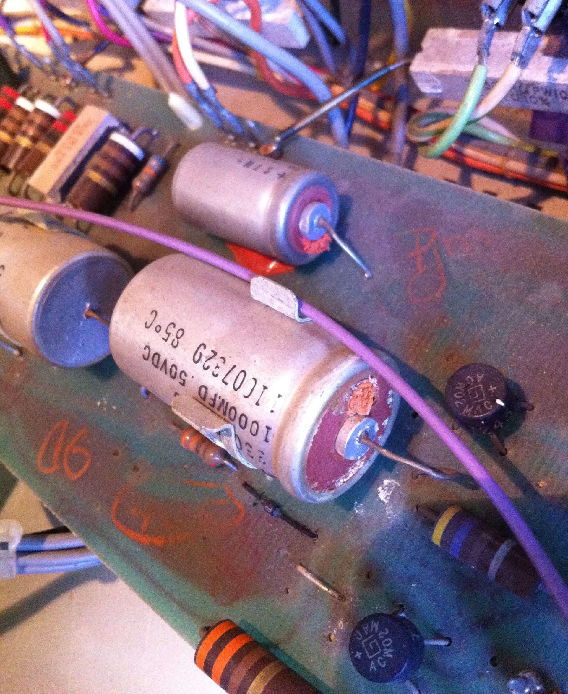 Guess it was only a matter of time before this thing failed since basically all caps in the amp with the exception of the two biggest, the 3450uf/75V cap and the 1000uF/75V cap, looked like this.