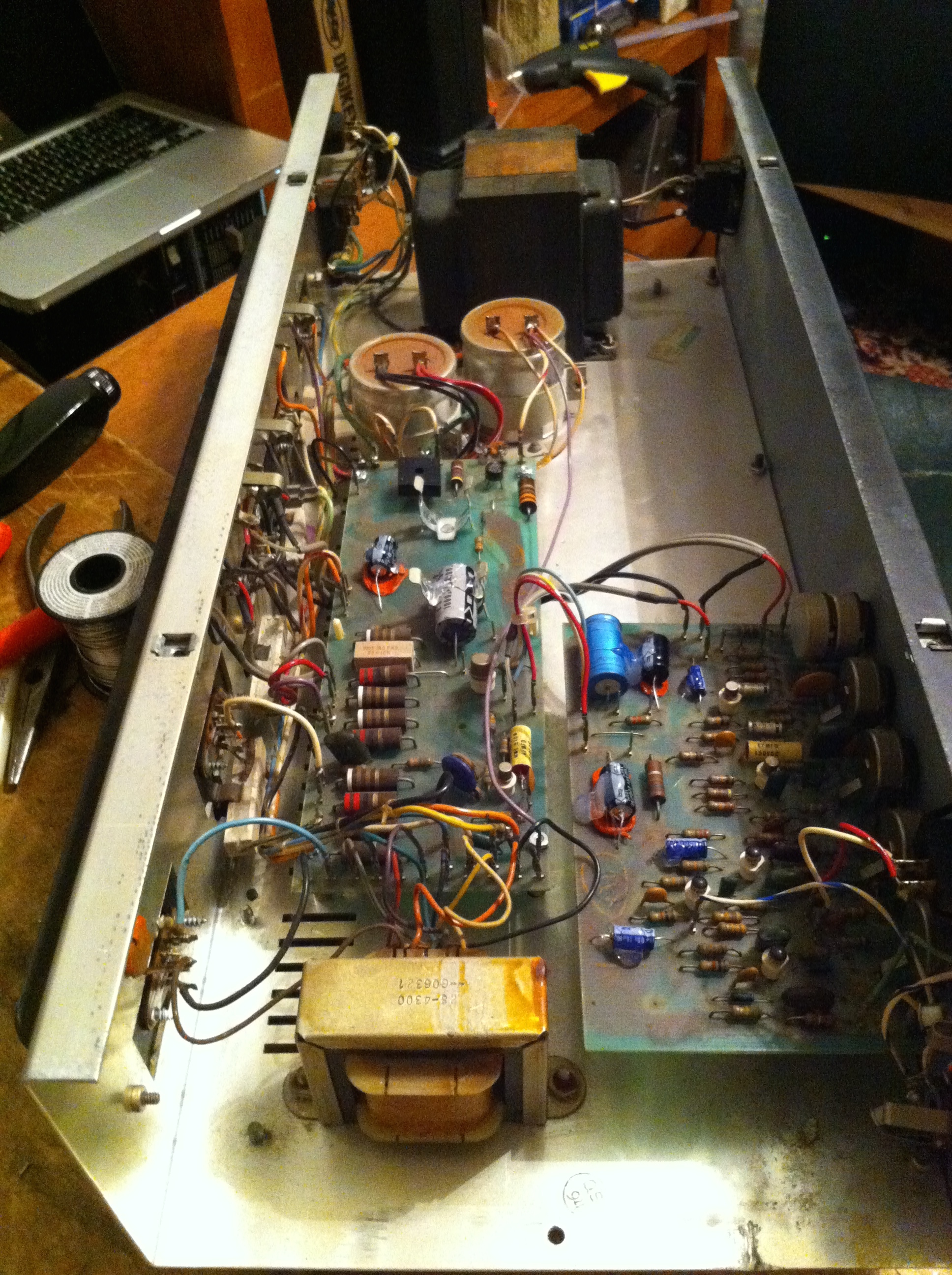 This amp is actually very similar to the red knob version in the preamp and output section but the power supply is totally different. Red knob version has a single secondary winding from the power transformer so there is only one voltage out from the power transformer and successive voltages are stepped down with dropping resistors and then tapped off the power supply. The early version actually has three secondaries each supplying different voltages to different parts of the amp. Each supply has a rectifier so maybe it should be referred to as the triple rectifier version…. Anyway in this case the rectifier for the preamp supply was shorted so the amp would trip the circuit breaker.