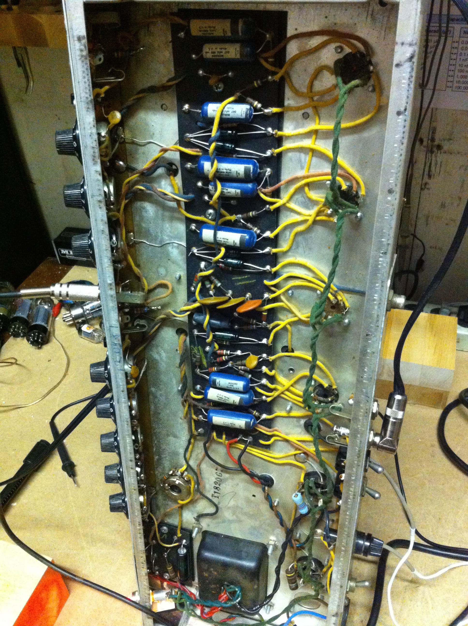 Pretty standard chassis shot and this amp actually works great because it has been totally recapped sometime in the recent past. All the coupling caps and the vast majority of resistors is original. It just had some nagging extraneous noise issues and a poor bias setting. Some of the jacks were corroded and and making poor connection. I replaced a few of the 100K plate load resistors in V1 and V2 and it reduced the crackling and popping in the noise floor. Input jack #2 on the vibrato channel wasn’t working and needed to be retensioned. Various tiny problems. I believe this is considered a 40W amp and per my measurements it was doing 47W at clipping into 4 ohms. Maybe because of higher wall voltage these days.