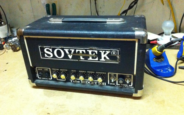 Cool, tiny little amp, Sovtek MIG-50H. The high gain version of the MIG-50. As if the MIG-50 was not already a very small amp this is squashed together and is even smaller. Looks like the knobs have been replaced with Marshall-style ones on this piece.