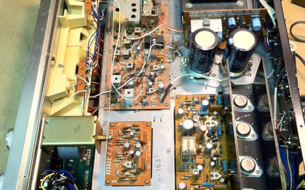 Big 10,000uF power supply caps watch out! Not exactly sure how old this stereo is but it was still working pristinely other than a few AUX and PHONO ins which were cutting in and out.