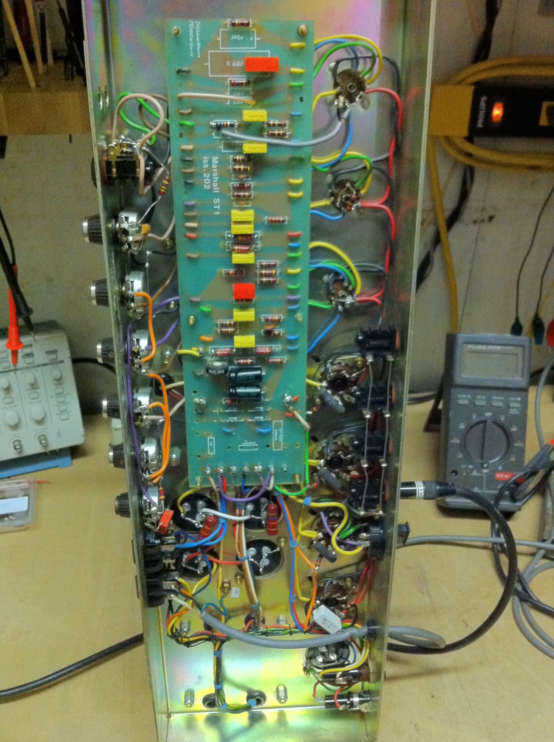 Seems like these amps are known to squeal when the volume and tone knobs are cranked really high. In my experience a 1000pF/.001uF cap across V2A’s plate resistor will rid that. V1A’s 68K control grid resistor is mounted on the PCB with a shielded cable going to the grid. I could still hear some radio coming through with volume cranked so I tried moving the grid resistor to the tube socket with good results.