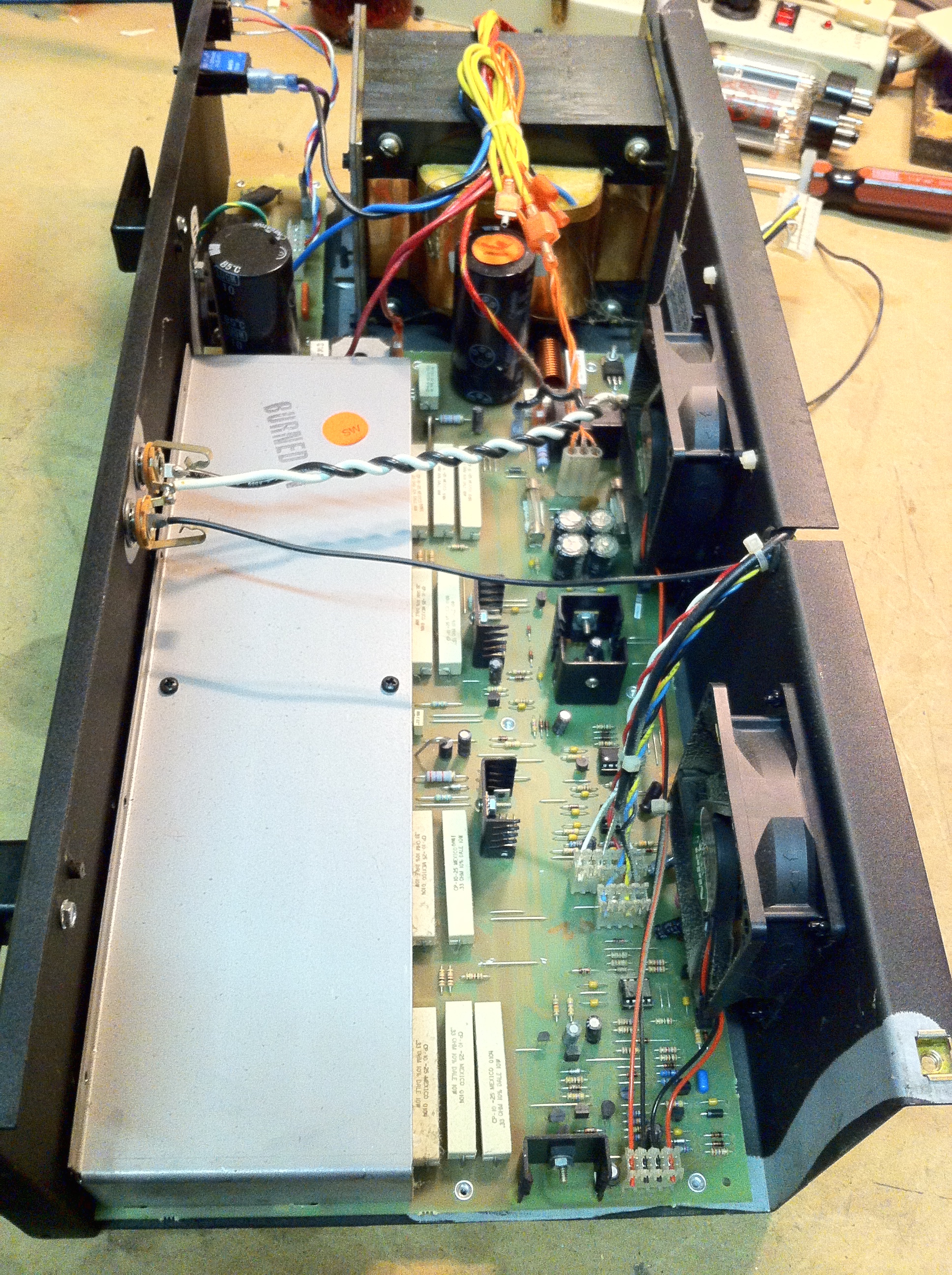 Peavey Firebass 700. This amp is extremely loud and will do 700W at 2 ohms. I’ve had a few of these and they’ve had the same problems caused by the same thing — signal cutting out or amp actually losing power because of broken solder connections, because this thing is really loud.