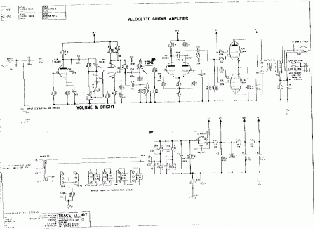 Has just a preamp tube, a phase inverter, and two EL84s in push/pull. Bias is extremely hot on this one and will exceed the plate dissipation of most tubes. I added 22 ohms of resistance in series with the 120 ohm cathode bias resistor to tone it down a bit. This amp had an open screen grid resistor on one of the power tubes. Because of this the other tube was redplating badly.