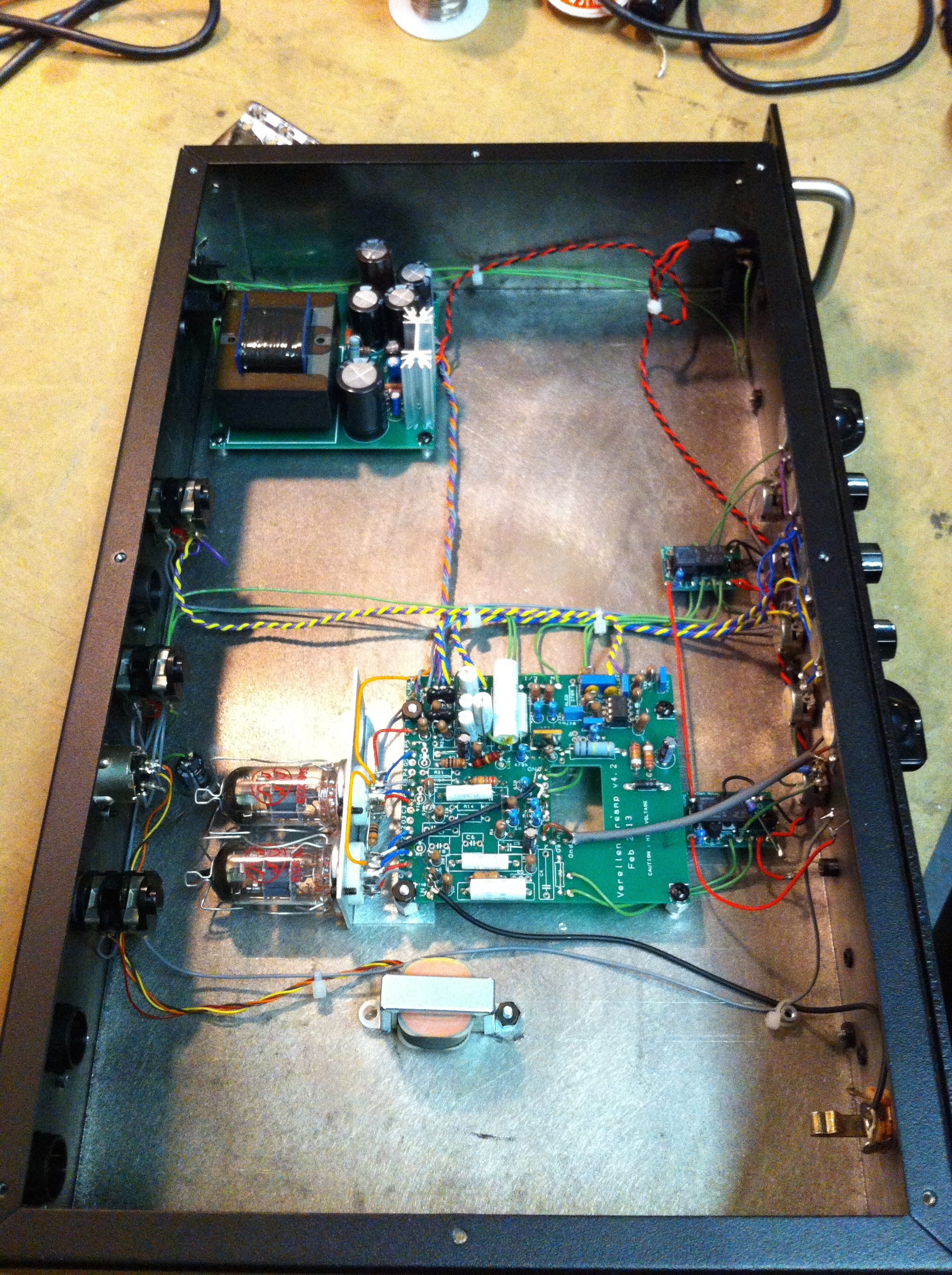 Verellan Meatsmoke preamp. From what I gathered this was some sort of kickstarter prototype and only 5 were made. This is #2. There was an error in either the build, or the printing of the PCB, so a 100K resistor needed to be removed, and another one added between two caps in the preamp.