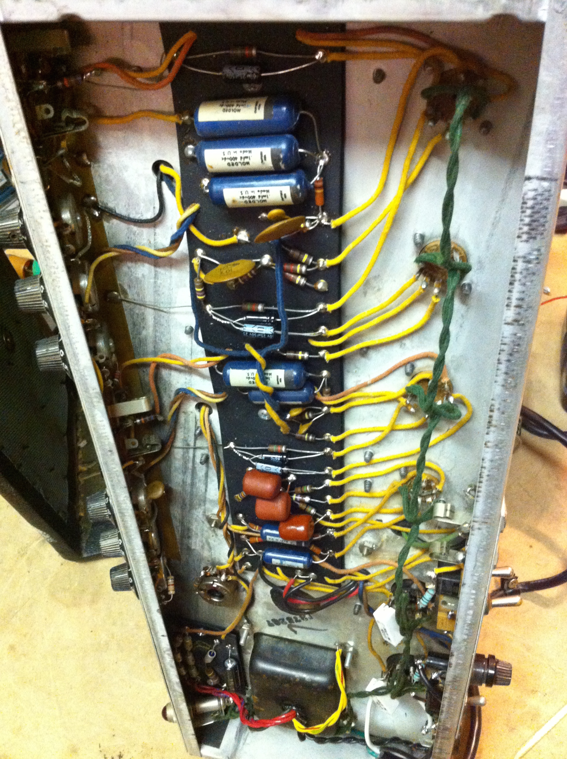 One of the power tubes had fallen out of the socket and was re-inserted in the wrong orientation (center pin to line up the tube was broken off). It also was really noisey on channel 1 because the V1 grid wire was right next to the heater wire. Moving it over 2″ removed the hum.
