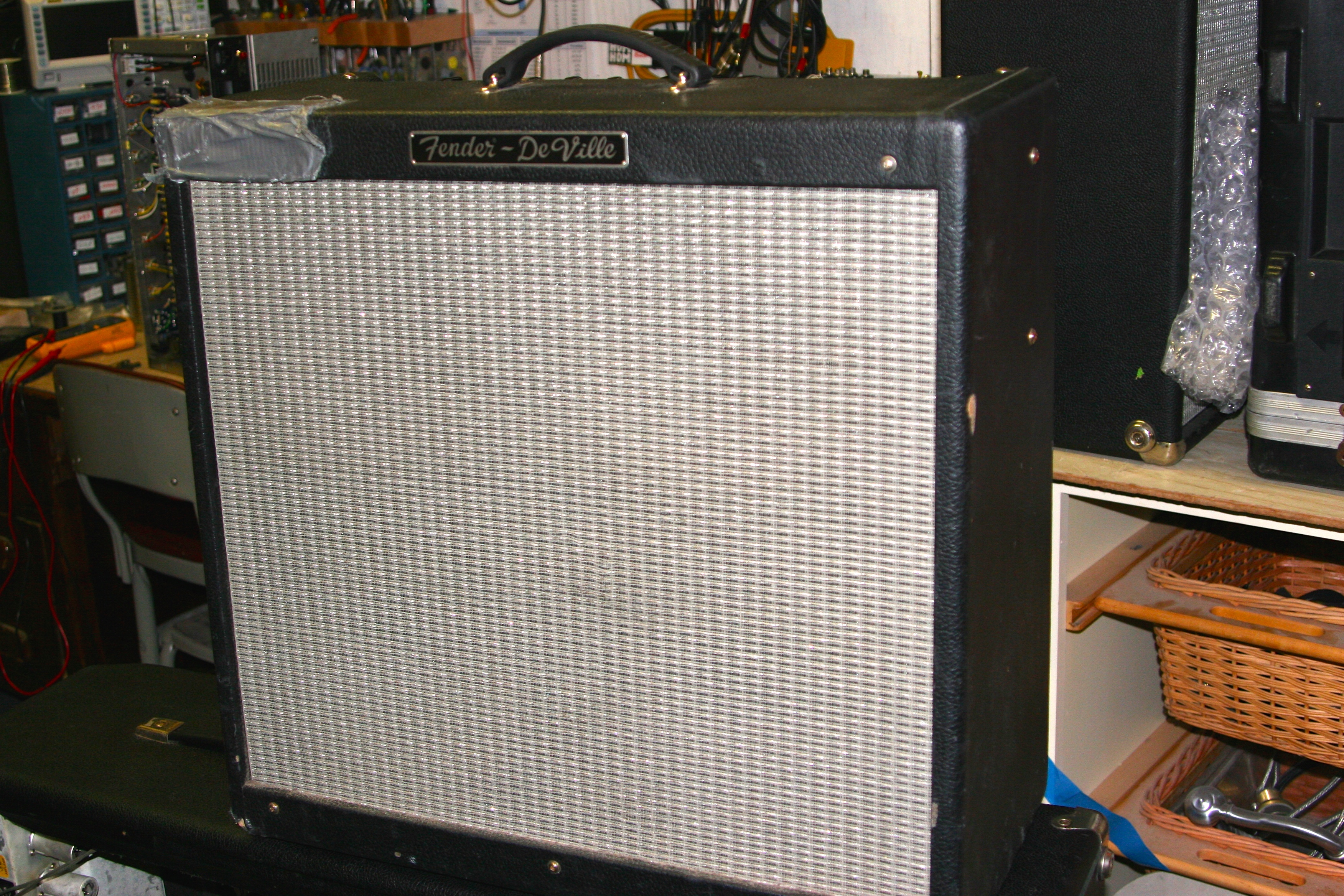 Fender Hot Rod Deville. This one had been through the shit. Power tubes were still functioning but were totally rattley. Sometimes elements in the tubes rattle loose from the vibration of the speakers. Lots of screws in the enclosure and screws holding the speakers were also loose, adding to the terrible rattley, distorted sound. Reverb tank didn’t work and needed to to be replaced.