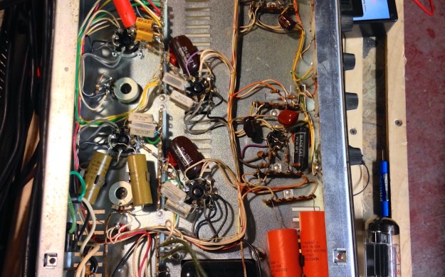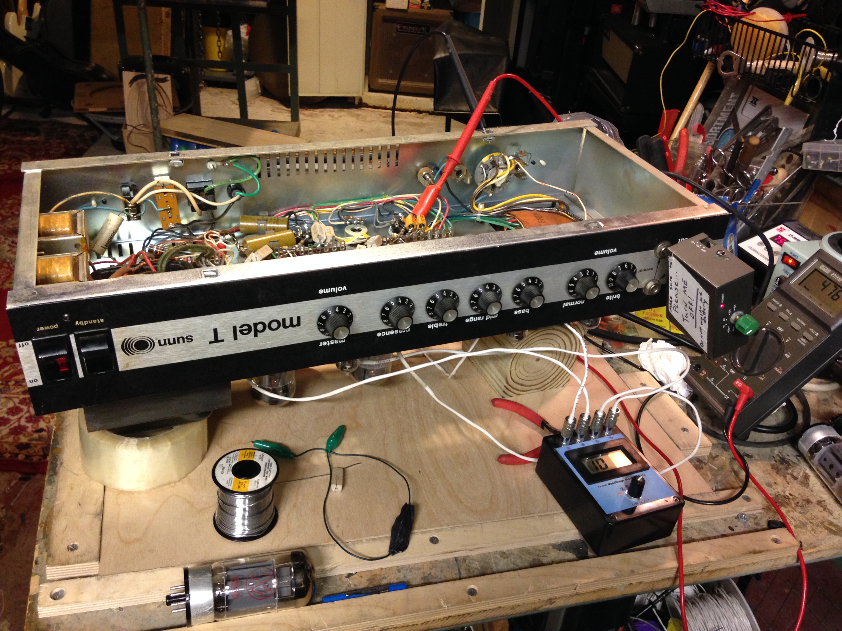 Kind of a museum piece. Old caps date it to 1973. Sadly the streak of original is over. A power tube died and took out the plate and screen grid resistors with it. You can see they are replaced with the heat sink style 10W resistors where the multimeter lead is clipped on the tube socket. Other than that this thing seems to be untouched. It’s not even dusty inside because the owner has the Sunn slip cover that came with the amp.