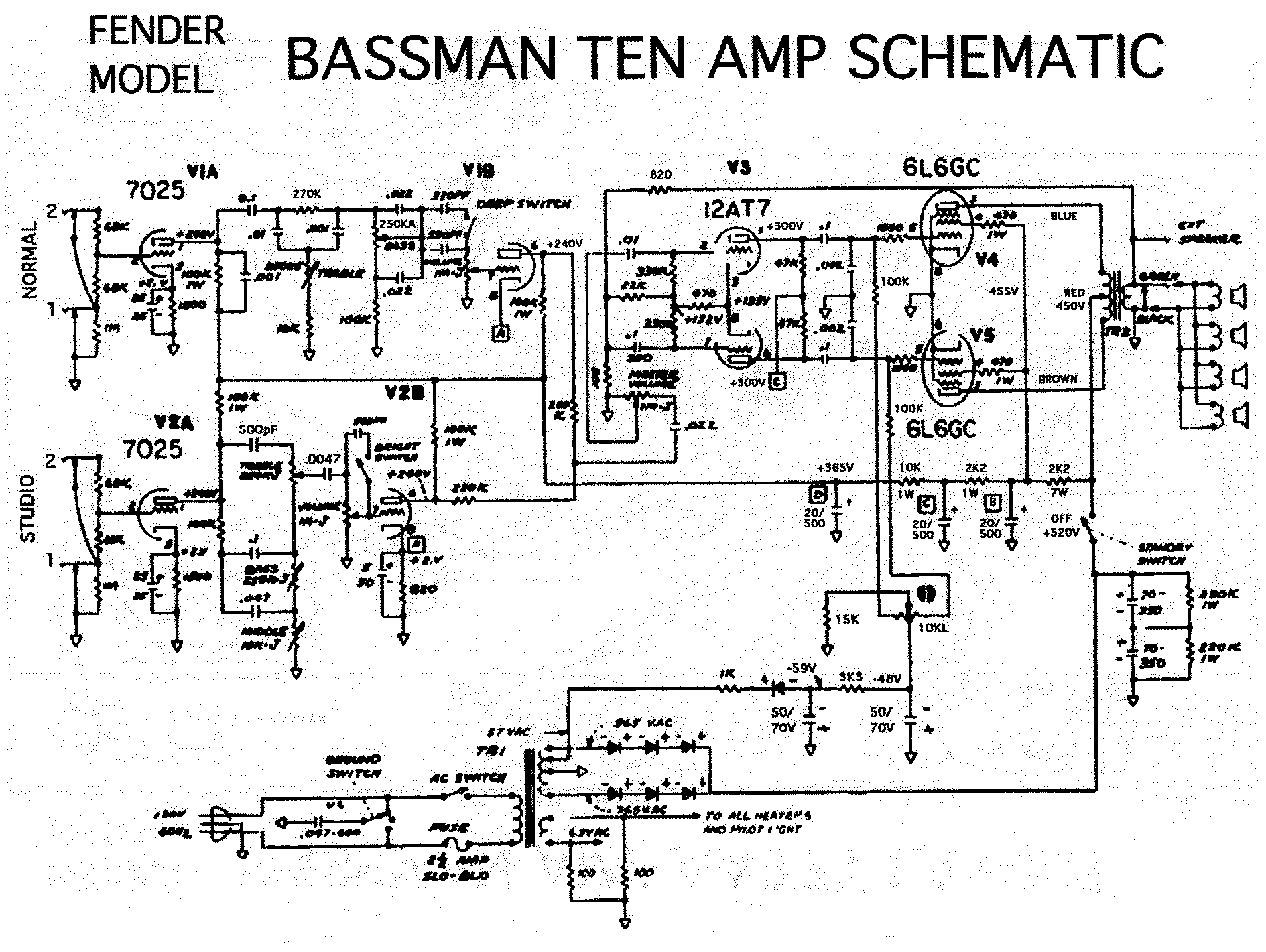 Another Bassman variation, the Bassman Ten. Sweet little 4×10 combo with both channels blend-able because they are in phase. Most of the other Fenders have channels 1 and 2 out of phase because of the added reverb stage of channel 2. This amp is really clean, even when cranked. Strangely has four 32 ohm speakers wired in parallel for 8 ohms. Did 42W at clipping with two 6L6GCs..