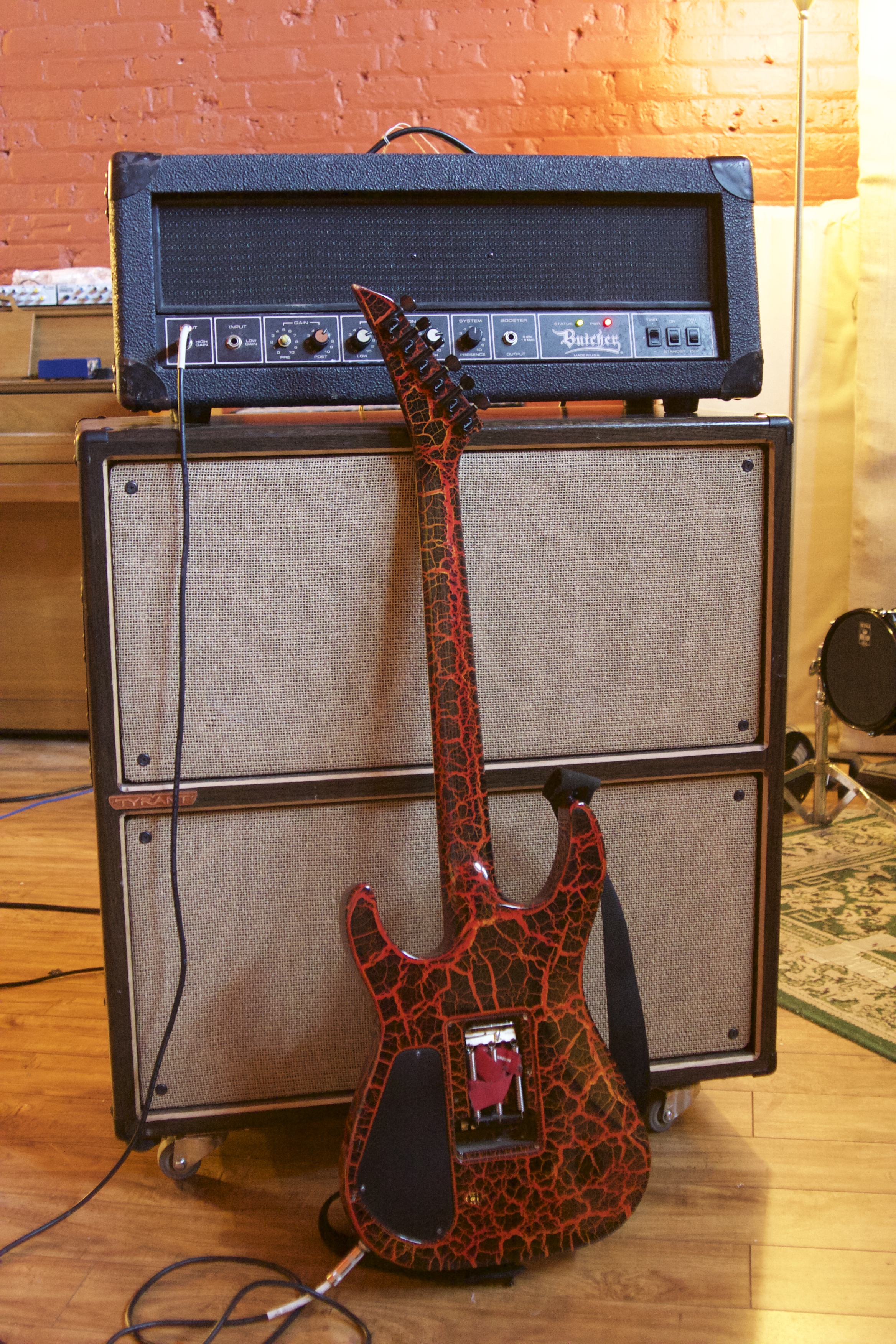 Peavey Butcher on the bench. The lower gain predecessor of the VTM 60/120. The Butcher logo is extremely metal but it actually does more rock-style tones. It’s all good it’s from the mid 80s or so.
