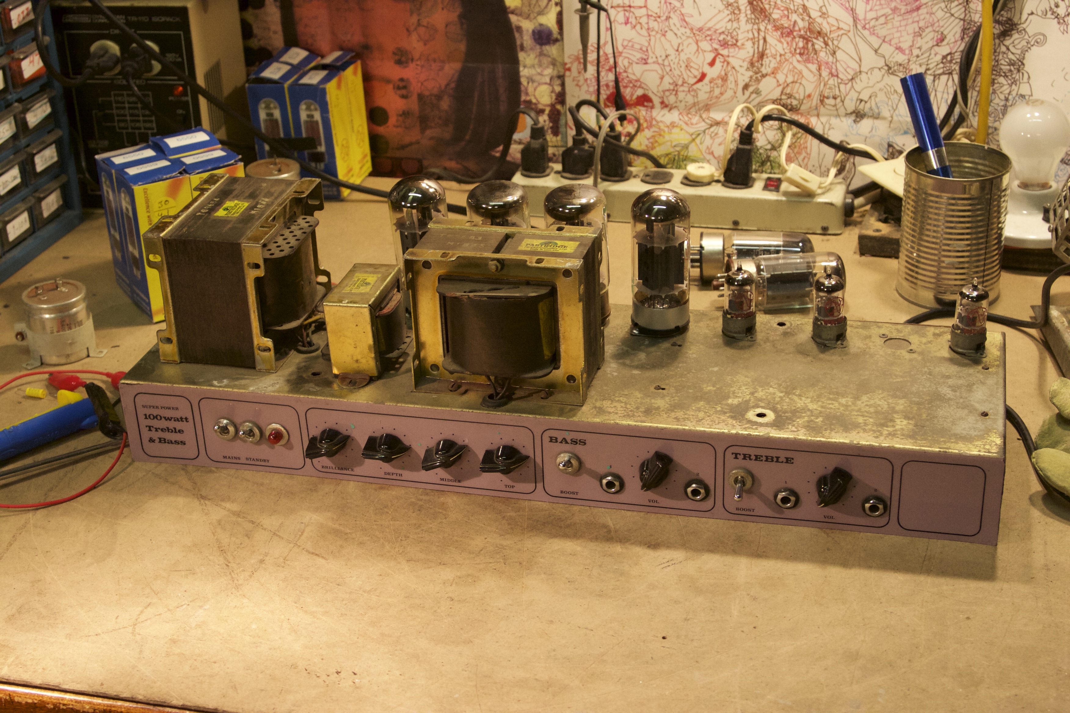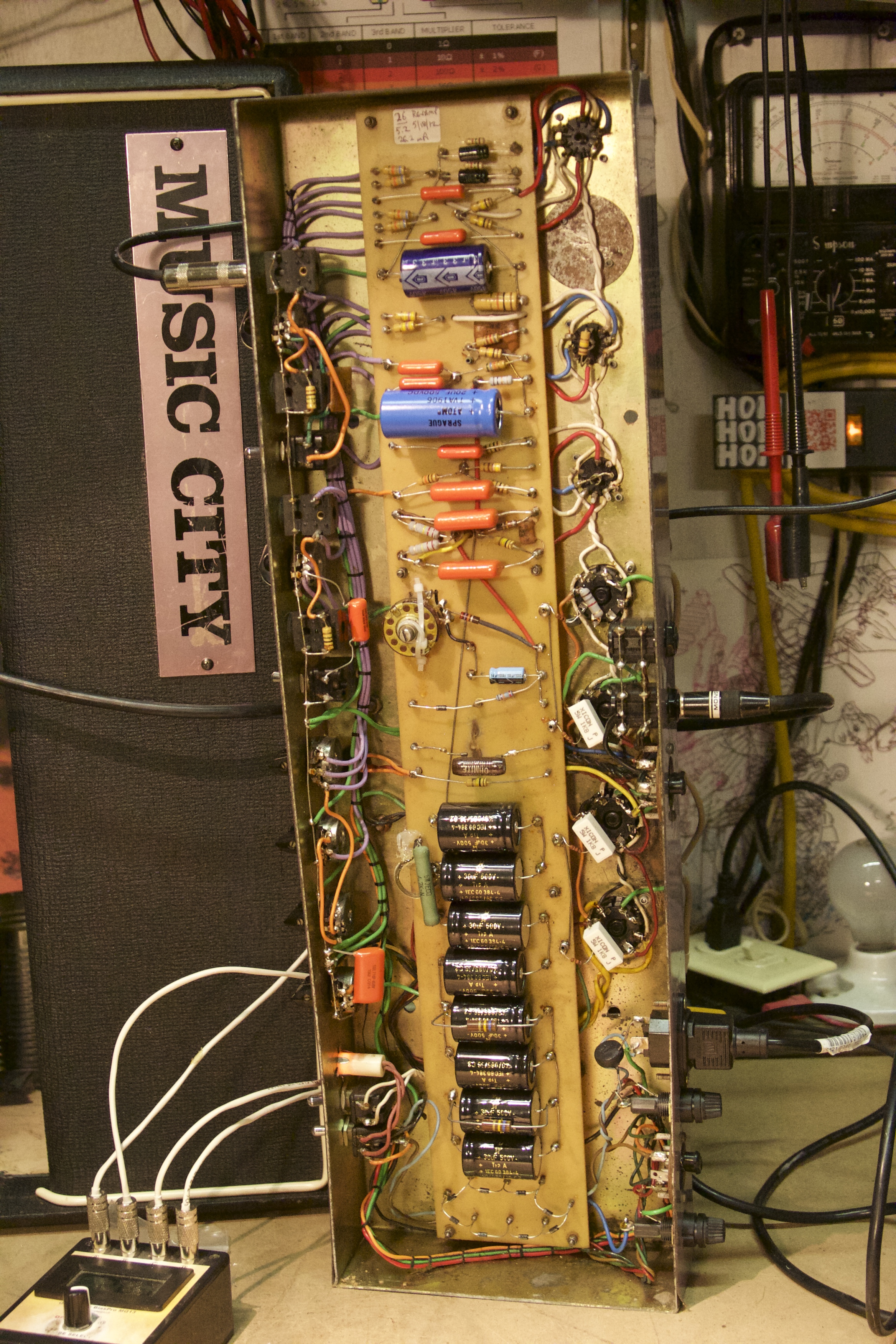 Music City Super Power Amplifier Treble and Bass yay. Bet you will never see one of these again. I hope you do though. Made for the Music City Music Store in the UK by Laney some time in mid 70s. Supposedly very similar to the Laney Supergroup but not an exact copy. This thing has been totally recapped, and even all of the coupling caps have been replaced with orange drops. That’s too bad, because it probably had the old yellow mustard caps originally. Oh well, sounds great, who cares.