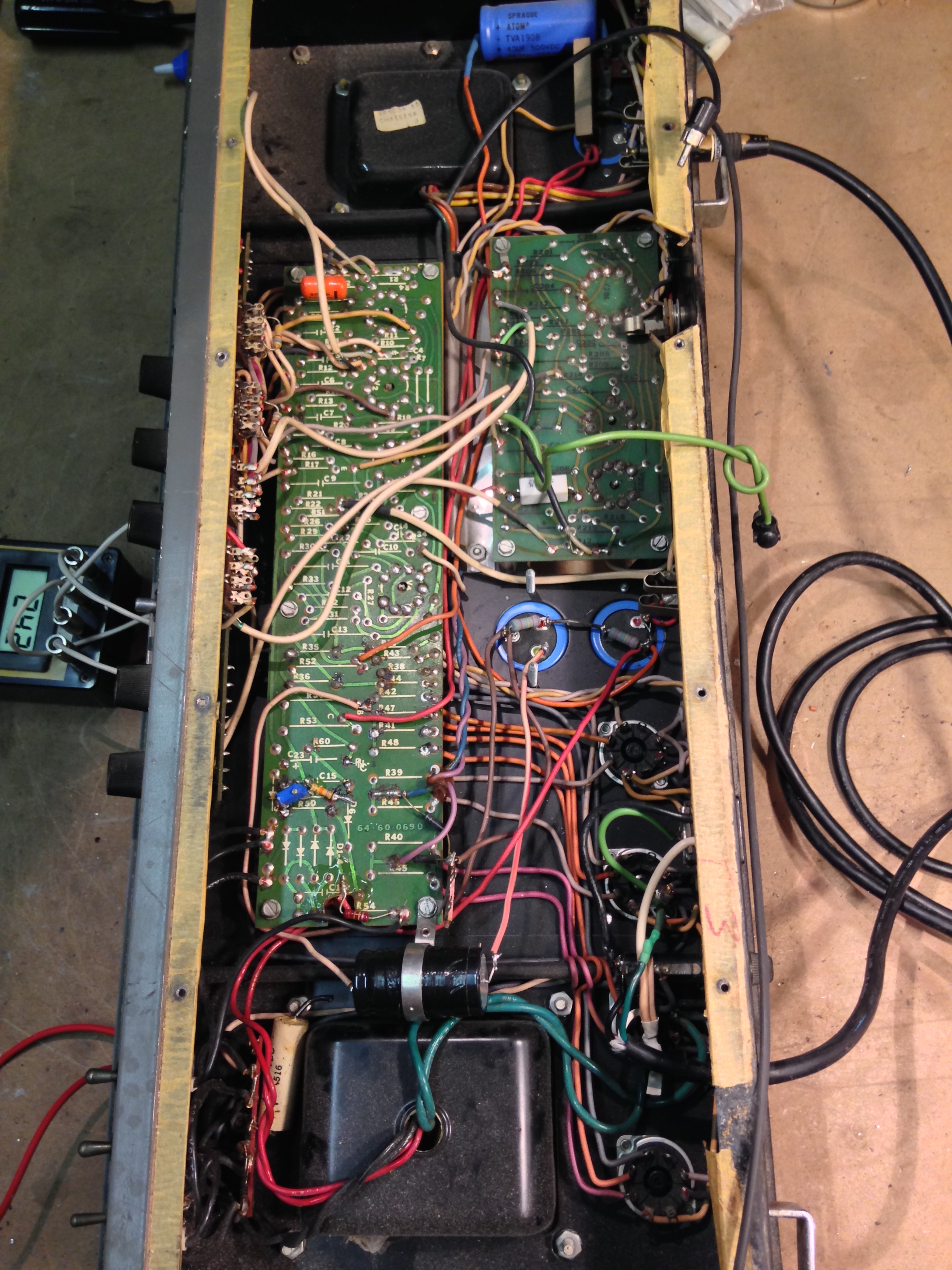 Yay my favorite amp, Ampeg V4. These amps are notoriously unreliable probably mainly because they’re from a different era where tubes were more robust, but also because with the tubes under the chassis they run hot when all the heat just rises up into the chassis. To top it off, the power transformer and power tubes (all the hottest parts of the amp) are all shoved together in the corner of the chassis right next to each other. Really not a good idea. Very surprising really that Ampeg’s thermal design for this amp is so terrible and pretty much all other aspects of the design are totally awesome. They even floated the chassis to isolate it from cab vibration with rubber grommet mounting brackets. So cool.