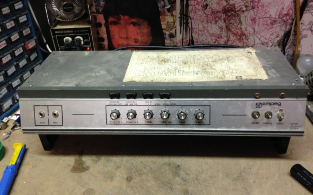 Gotta love how all the old Ampegs came with the schematic pasted to the chassis. This one is in good shape and has most of it’s screen printed front panel graphic still intact. Lots of these have worn off over the years. I could write about the V4/VT22 but there is an awesome write up at the Atomium Amps site. Might as well just peruse that and get into it. Lots of great info — Atomium Amps V-4 Analysis (post restoration).
