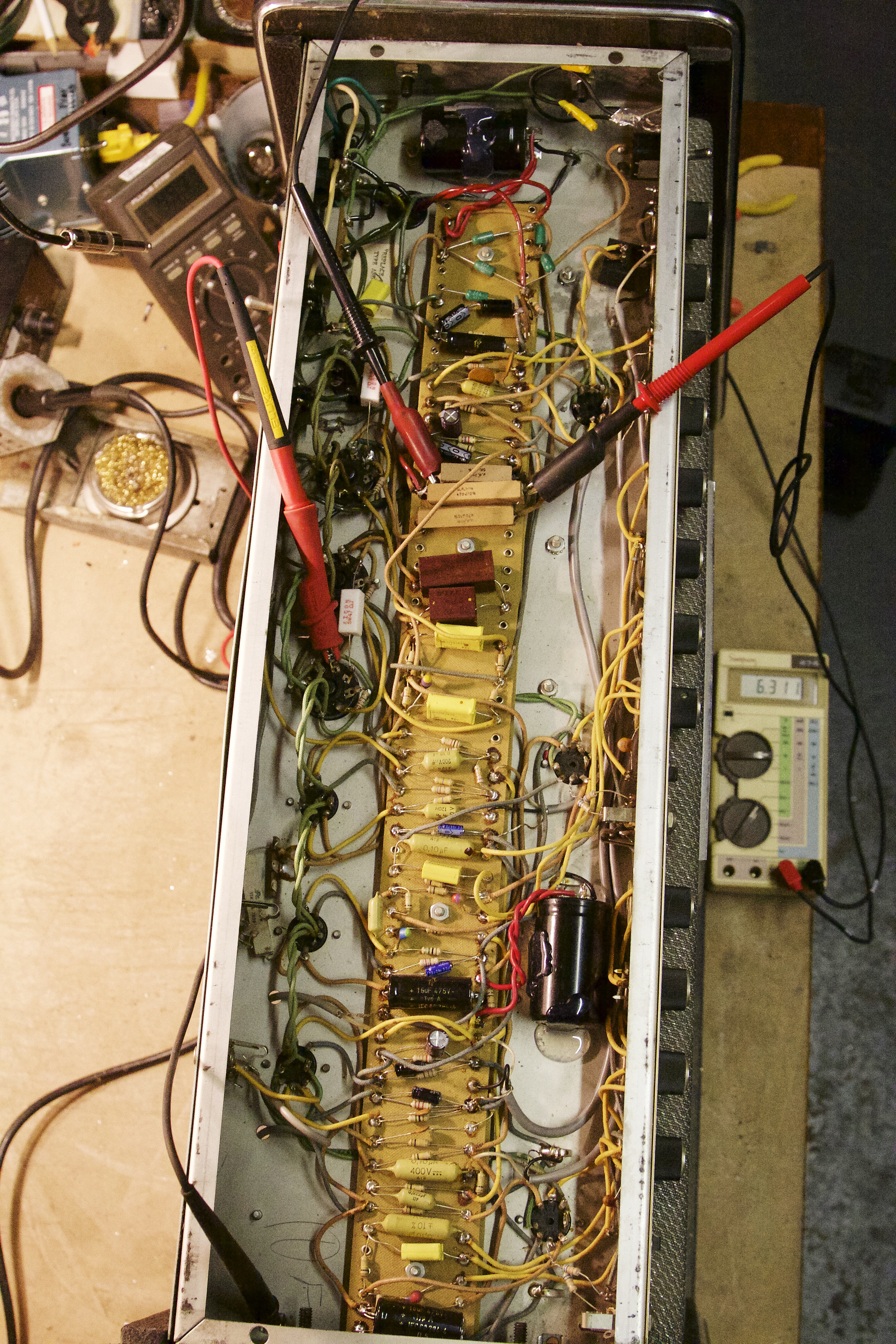 Quite a long tag strip in this one. I think it wins the world record. The brown boxes front and center are thyrectors, a part I have never encountered before. They are dual directional diodes used in this case for output transformer protection. They bridge across the two plate leads and if you’re unfamiliar with them and they short it will make you think the OT has gone. Nice signal right up to the power tube grids but at the plates its weak and terribly distorted. When the amp is pushed the B+ drops dramatically. Barely any sound comes through the speakers. Power tubes are burning hot as if they’re putting out 100W. Seems like in other OT protection schemes when the protection fails the amp blows a fuse and shuts down but in this case it does not. I replaced the shorted thyrectors with R3000 diodes from plate lead to ground a la modern Fenders and whatnot. Don’t want to use more thyrectors, they are selenium rectifiers — a component of yesteryear. Selenium is toxic.