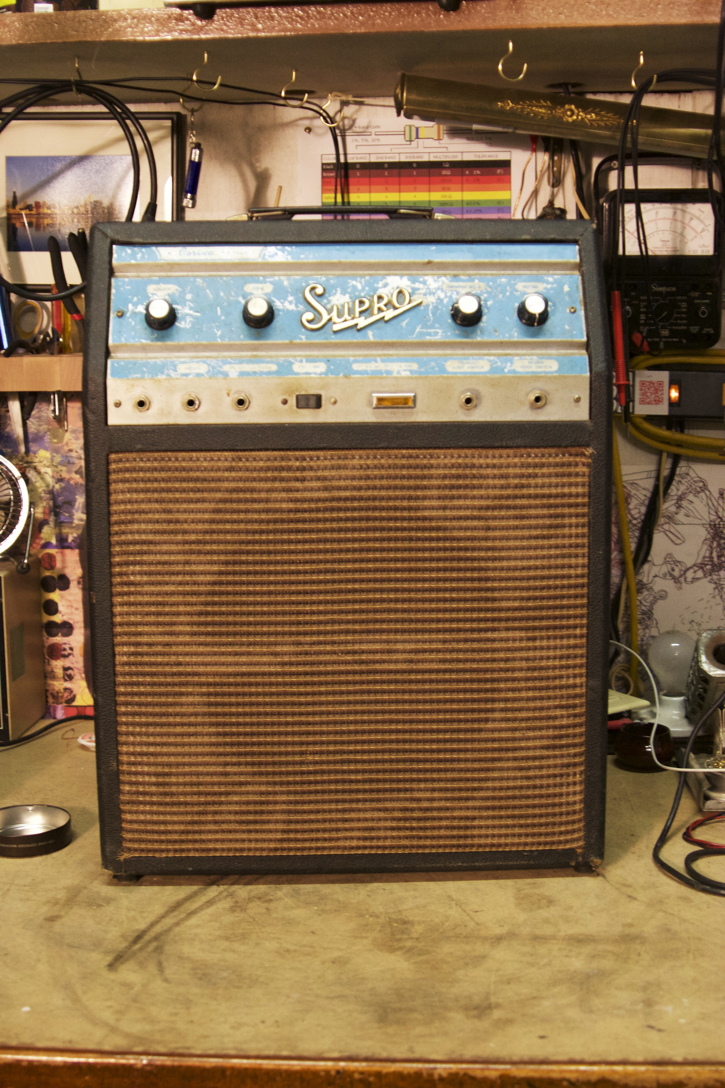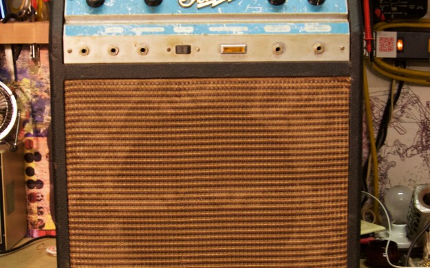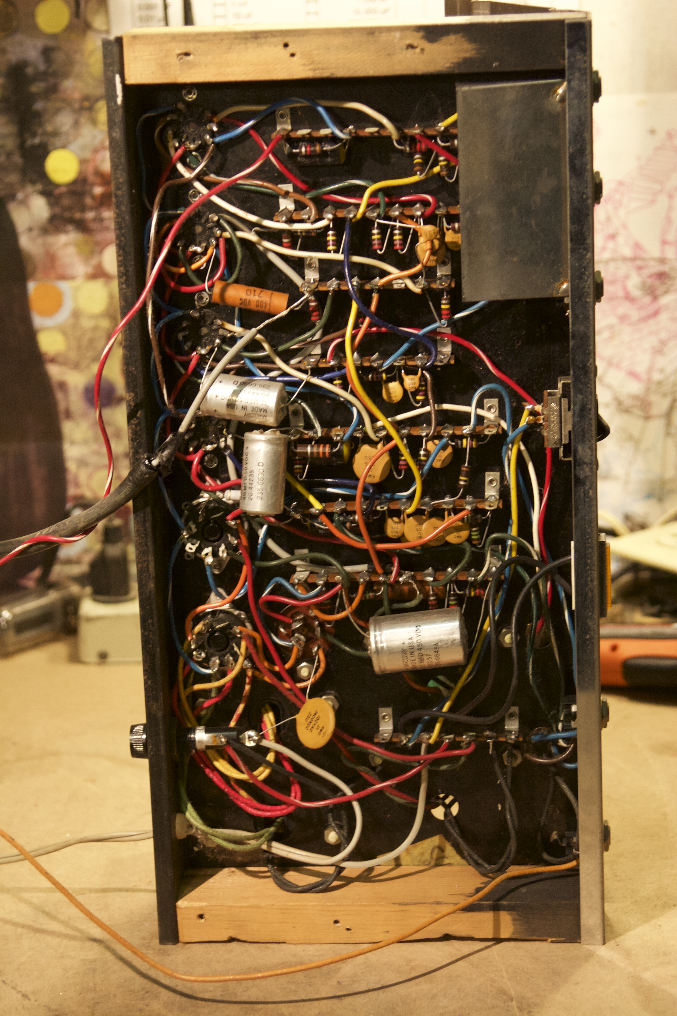 Old Supro Corsica made in Chicago back in the day by Valco. This is the opposite of the Hiwatt DR103 in the last post in regards to layout and wiring — total rat’s nest. Layed out in true point to point with all components mounted to pots, tube sockets and tag strips, but what a mess. This thing needed a new power tube and reverb tank so it could relive the old glory days. Mallory caps are from the year 1966.