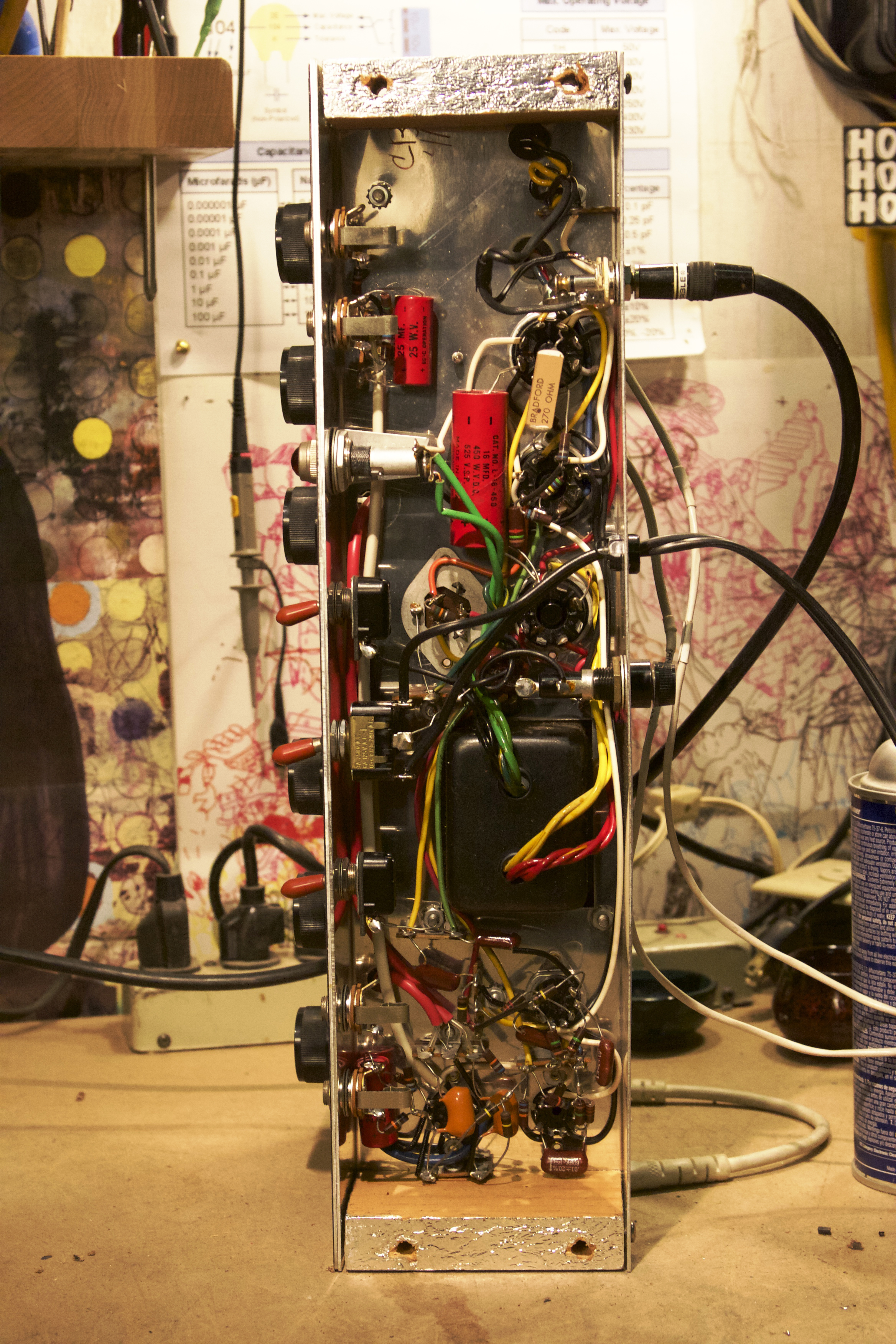 I think this one had been sitting for a while. V1 was totally crackley but there weren’t any cracked solder connections like I expected (it was pretty bad), the tube socket was just all old and crusty and corroded. Worked nice after a good cleaning of the pots and jacks and tube sockets. Kinda noisey with the old caps and possibly also because of the carbon comp 100K plate resistors in the preamp but it will stay that way and stay original because it works pretty good. Check out the wiring/routing of the preamp towards the bottom of the chassis — a big tangle of resistors and caps flying everywhere, looks awesome.