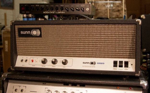 Sunn Sonaro with a crushing 585V at the power tube anodes. Just has one 12AX7 for the preamp, a 6AN8 phase inverter and two KT88s for the output in an ultralinear arrangement like so many of the old Sunns like to do. I recapped it for reliability since it is a studio amp. It was all original from 1971, seemingly untouched and still working good.