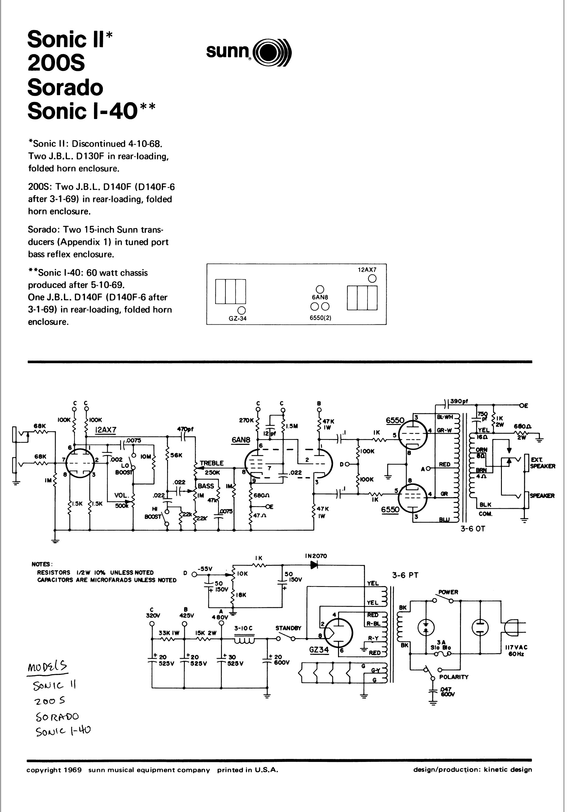 This is not the right schematic since it has a tube rectifier and lower power supply voltages compared to the Sonaro pictured above. I have not verified this through and through but the preamp, phase inverter, and output section all seem to be the same though. Check out the Sunn 200S in the following post. It also doesn’t match this schematic.