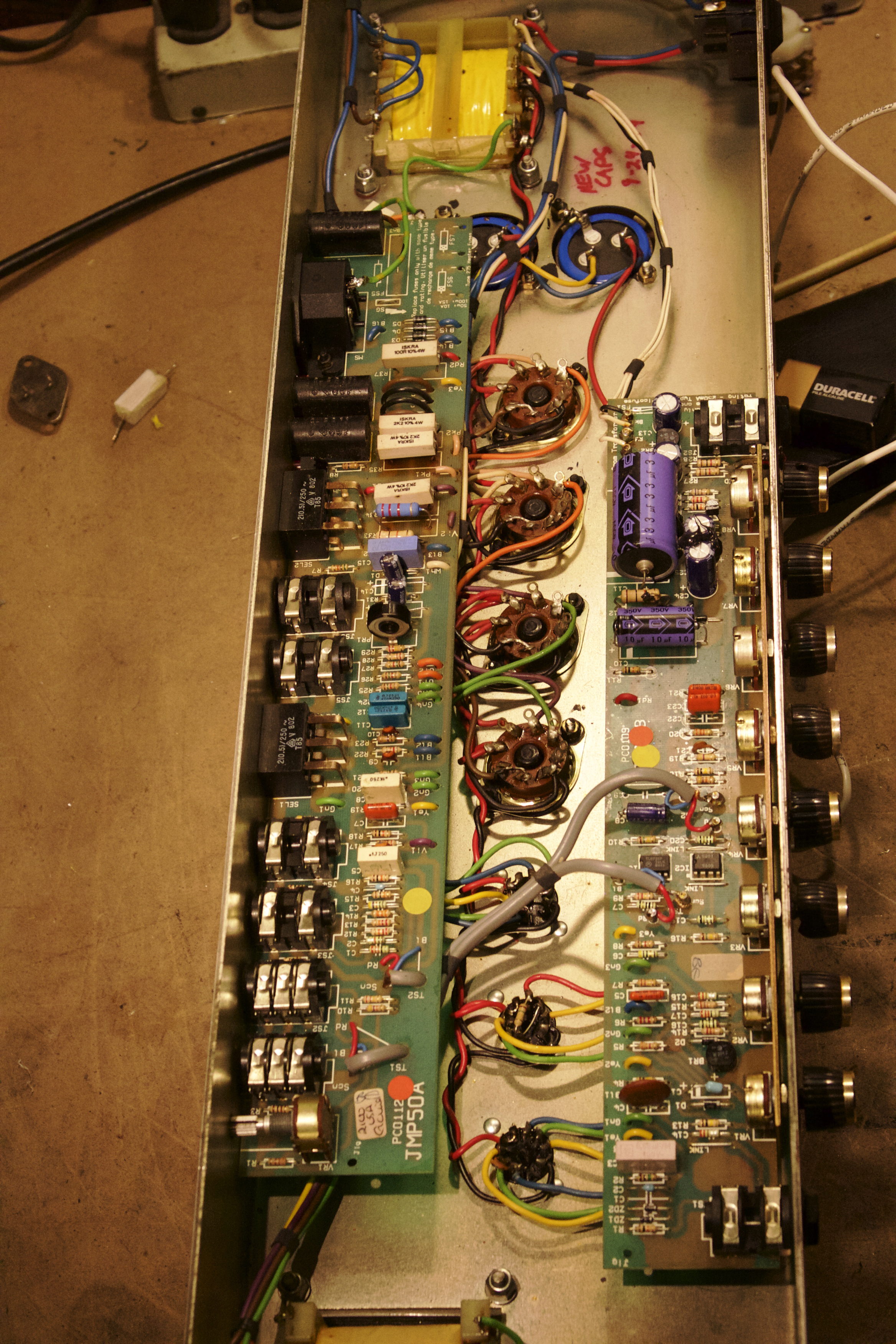 JCM900 on the bench after it had been somewhat abandoned. I think it was shelved over 5 years ago for sounding too trebley and blowing a fuse. When I got it it worked actually but had weak output. Power tubes were weak and one was not working at all because the 2.2K screen grid resistor was burned open. Someone had recapped this amp in the past but decided to leave the bias supply caps original. I hate this blasphemous recap style. Why would you not replace two $2 caps that are arguably the most important ones in the amp. If you lose the bias supply you probably lose the power tubes. I always see recapped amps with original bias supply capacitors and I just do not understand.