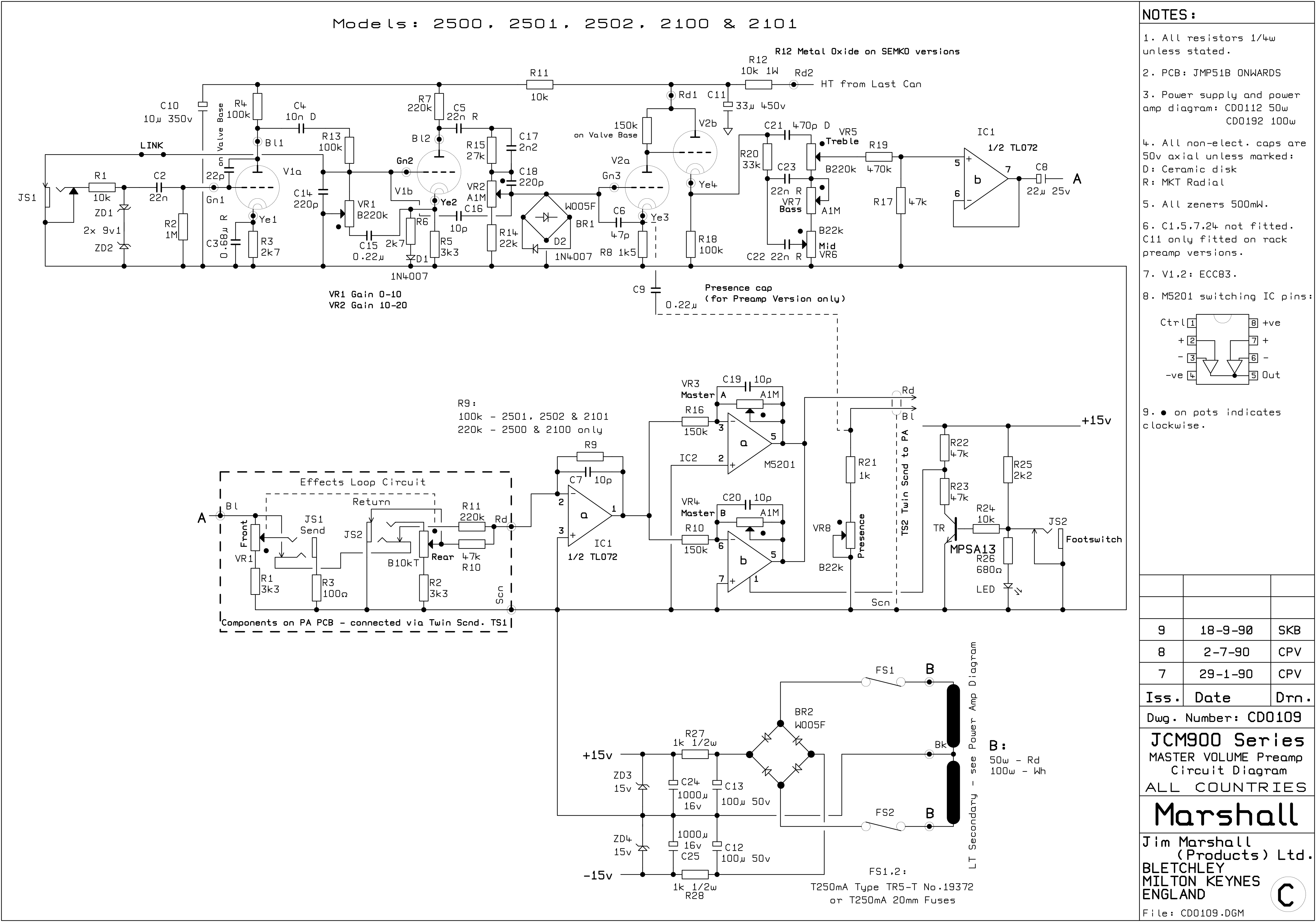 Since this amp was too trebley I did a mod that affected the negative feedback to try to give it more bass response. Putting a .001uF capacitor in series with paralleled C6 and R17 in the negative feedback circuit creates a shelving filter that does not feed back lower frequencies. So when lower frequencies are not fed back, they are not phase canceled in the phase inverter, and the amp has more bass response. Still sounded like a Marshall gain type of sound but at least had some heavy bass to go along with it to fill in the sound.