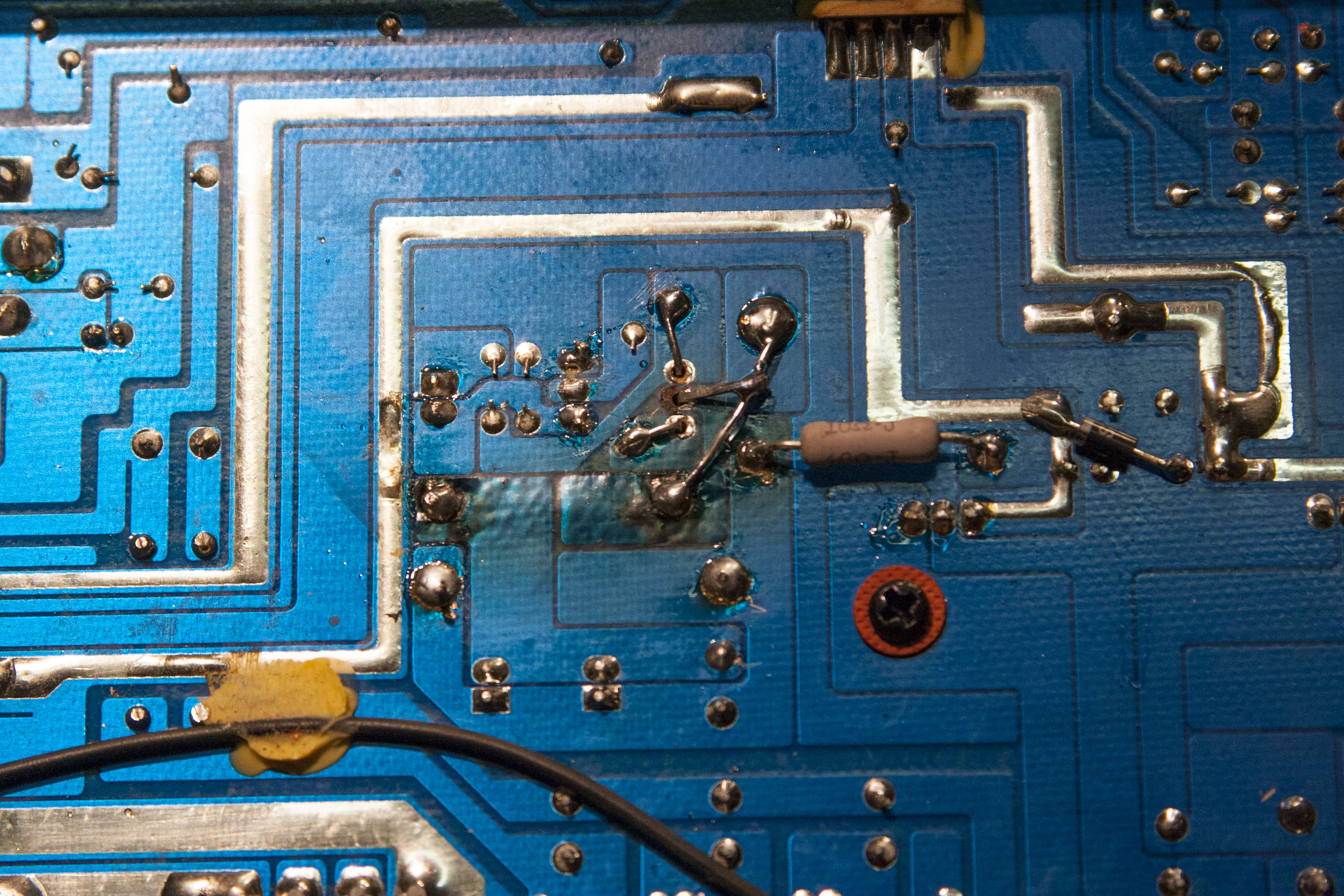 This board got all burnt up when this thing failed. The amp did not fail, but the fan, an output transistor, and a 10 ohm/2W resistor did. Not sure if the fan caused the transistor to fail or if it was the other way around, but this thing needed a little hardwiring because the board was so damaged. 2SC3117 transistor seemed impossible to find but as a last resort I called Hartke and they supplied it without a problem. Awesome support! Here is the Hartke LH500 schematic. Actually it is for LH1000 but same amp except twice as many transistors in the output section for double the power, wow.