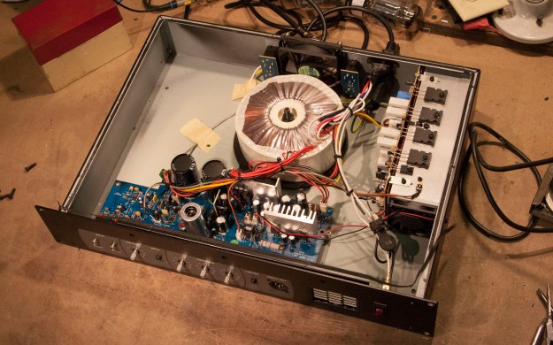 Hartke LH500 bass amp. One of those hybrid bass amps you always see that has a tube or two in the preamp and then a big, powerful solid state output section. Big heat sink is on the right with fan to keep those output transistors cool when trying to push 500W. Not an easy task. Airflow and fan placement are very important in amps like this if they are to be reliable.