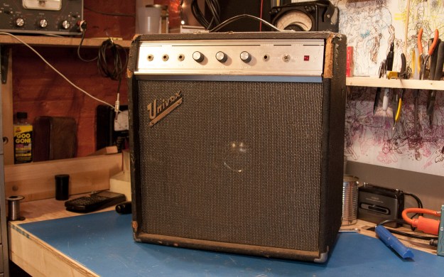 Cool, old Univox. Keeping it simple with minimal everything. Volume, tone and tremolo are the knobs and that’s it. Input jacks are guitar, accordian, and aux. Old school chrome dust cap on the 12″ speaker. Let’s the high frequencies roll.