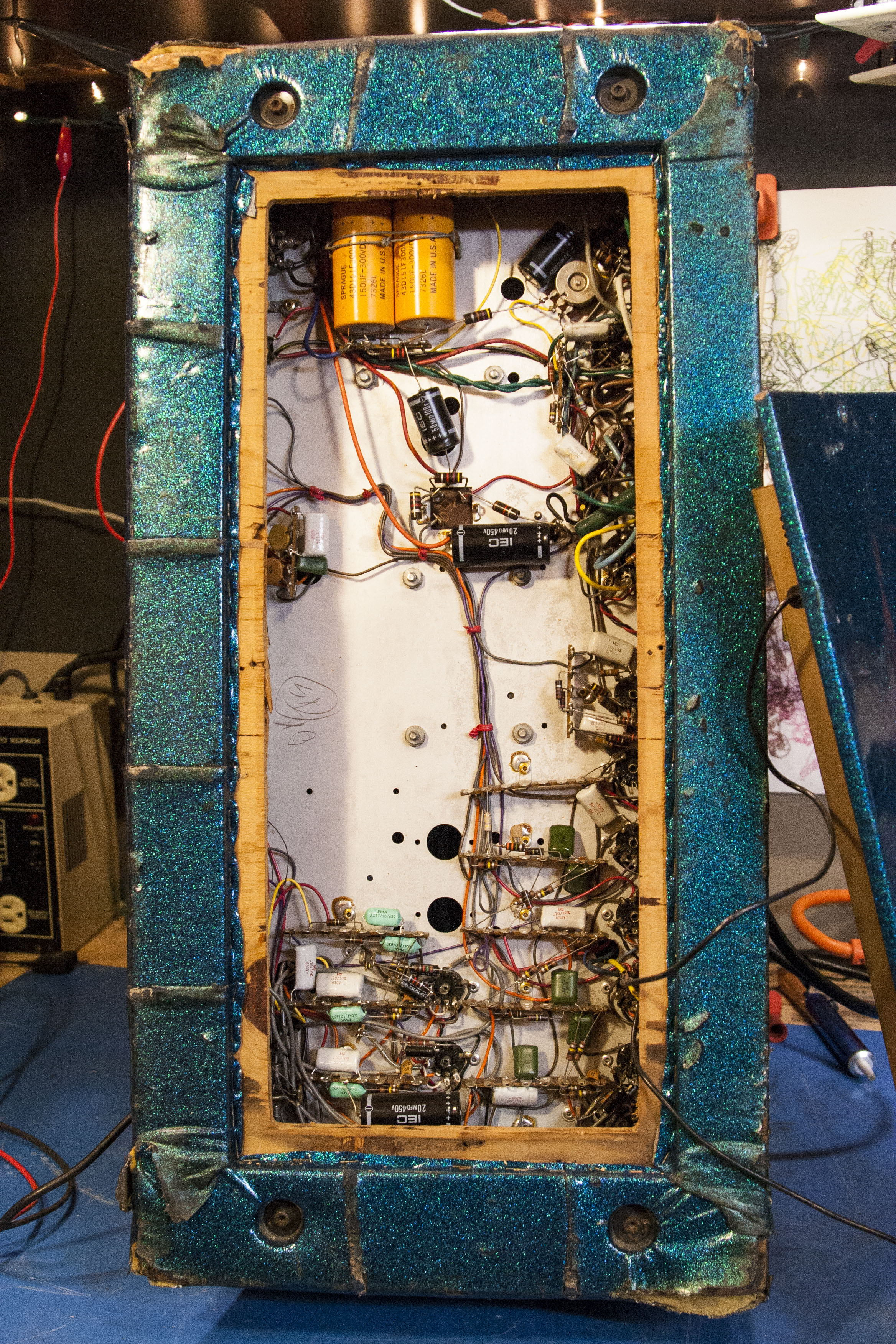 Bottom pops off for servicing and it’s all point to point with components mounted to tag strips, pots, tube sockets, etc. Old Sprague caps are from 1973 and still going. Had a bit of an uneven output because the 82K plate load resistor for the one side of the phase inverter was about 50K. The 100K read within tolerance. Mostly just needed some cleaning and a bias. Could be a cool test bed since it has four identical channels easily mod-able on tag strip. Running gain stages in series for high gain could be cool too.