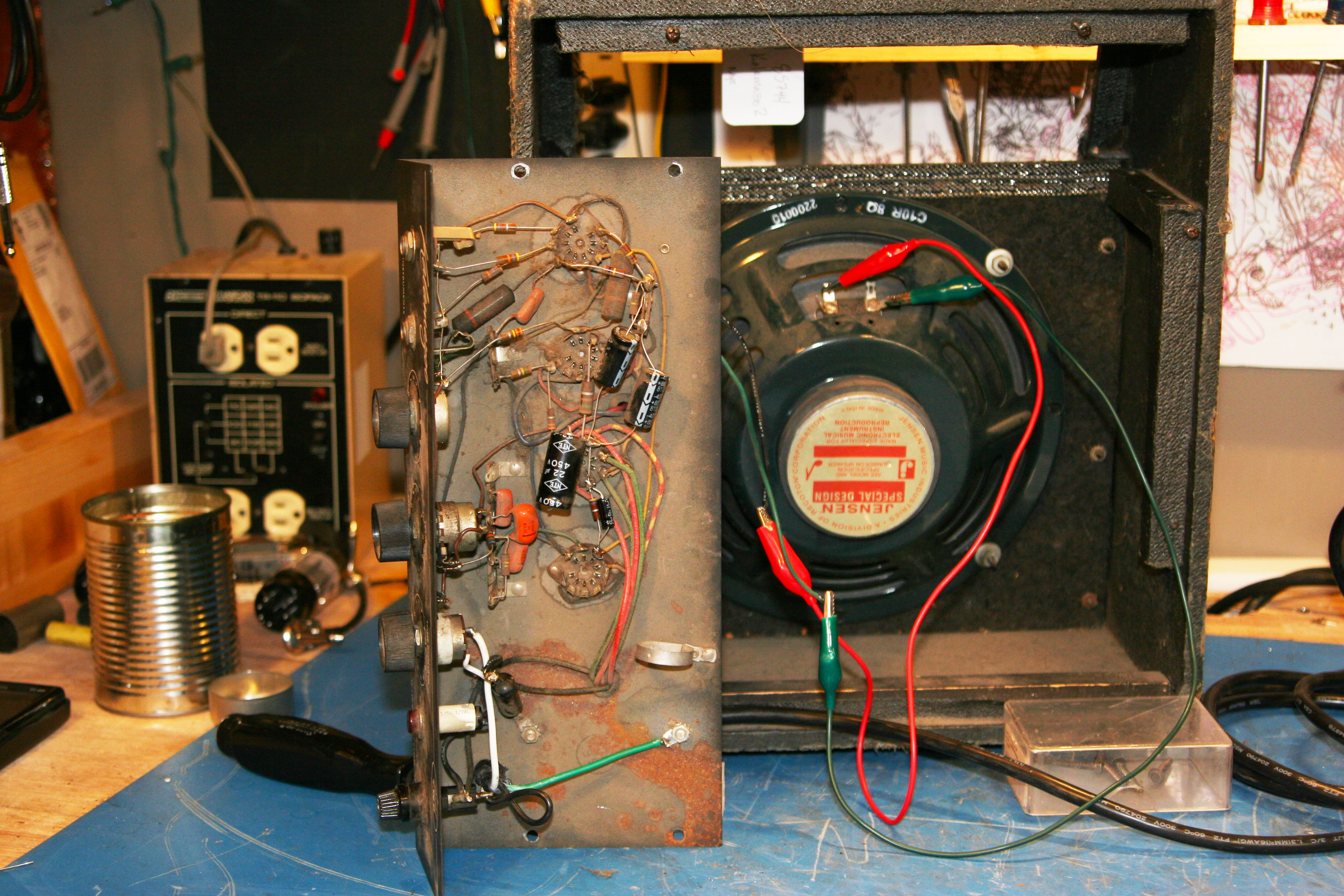Someone has put in a new Jensen C10R speaker (underwater incident?) and some NTE caps in the power supply to keep it going. It would not turn on because of a broken connection at the on/off switch, needed a 3-prong, and V4 cathode bypass cap needed to be replaced to make the tremolo work nice.