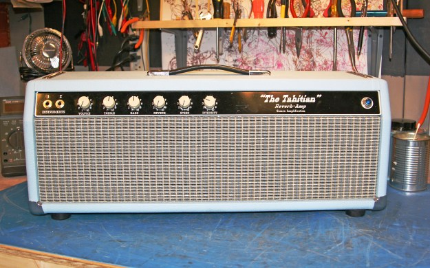 Gomez Amplification The Tahitian Reverb-Amp. Basically worked good but had some damaged power tubes in shipping. I think they were just left in the tube sockets when shipped and some got rattled loose and were rolling around inside the chassis and what not when it arrived. Two had broken guide pins and one did not work at all, but still had the guide pin. New power tube quad from the seller and it’s ready to go again. It’s essentially some sort of Fender derivative but they decided to go a little untraditional with a sky blue tolex, cool.
