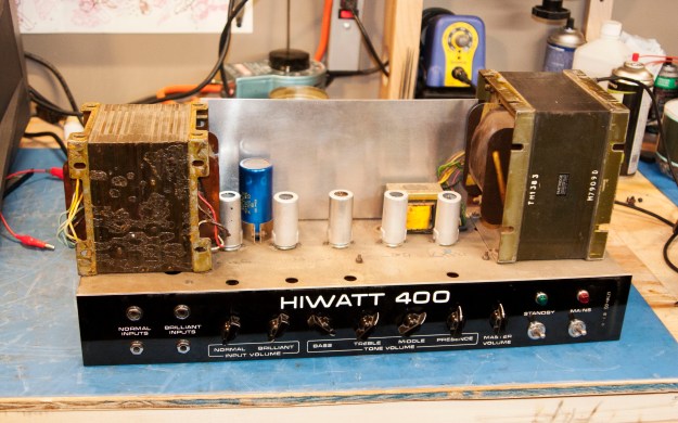 A real white whale, as it might be called. Really rare amp. But yet again another amp that’s called 400 but does not do 400W, oh well. Has 6 6550s behind the metal panel that shields the preamp tubes from the power tubes. Has 4 speaker jacks so you can run a boat load of cabs if you feel like carrying them all around. This one came in because a power tube was physically broken and causing the amp to blow fuses. The silver getter material had turned white, meaning that there is a crack in the glass somewhere and the tube is no longer a vacuum tube because the vacuum has been lost. So it’s just a tube that no longer works. Once it was popped open I also noticed it had a mish mash of 1K and 1.5K screen grid resistors for power tubes so I replaced them all with some new 1K 5W resistors as the schematic suggested.